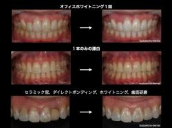 ホワイトニングには、 ・ご自宅で行うホームホワイトニング ・歯科医院で行うオフィスホワイトニング があることは良く知られていますが、 着色をとり、でこぼこな歯の表面を研磨することで歯を綺麗にする ・歯面研磨 「変色してしまった1本だけを白くしたい」場合などに行う ・漂白(ブリーチング) という方法も存在します。 これらの処置を併用することもありますし、 お一人お一人に合った処置方法を適切に判断することで より効...
